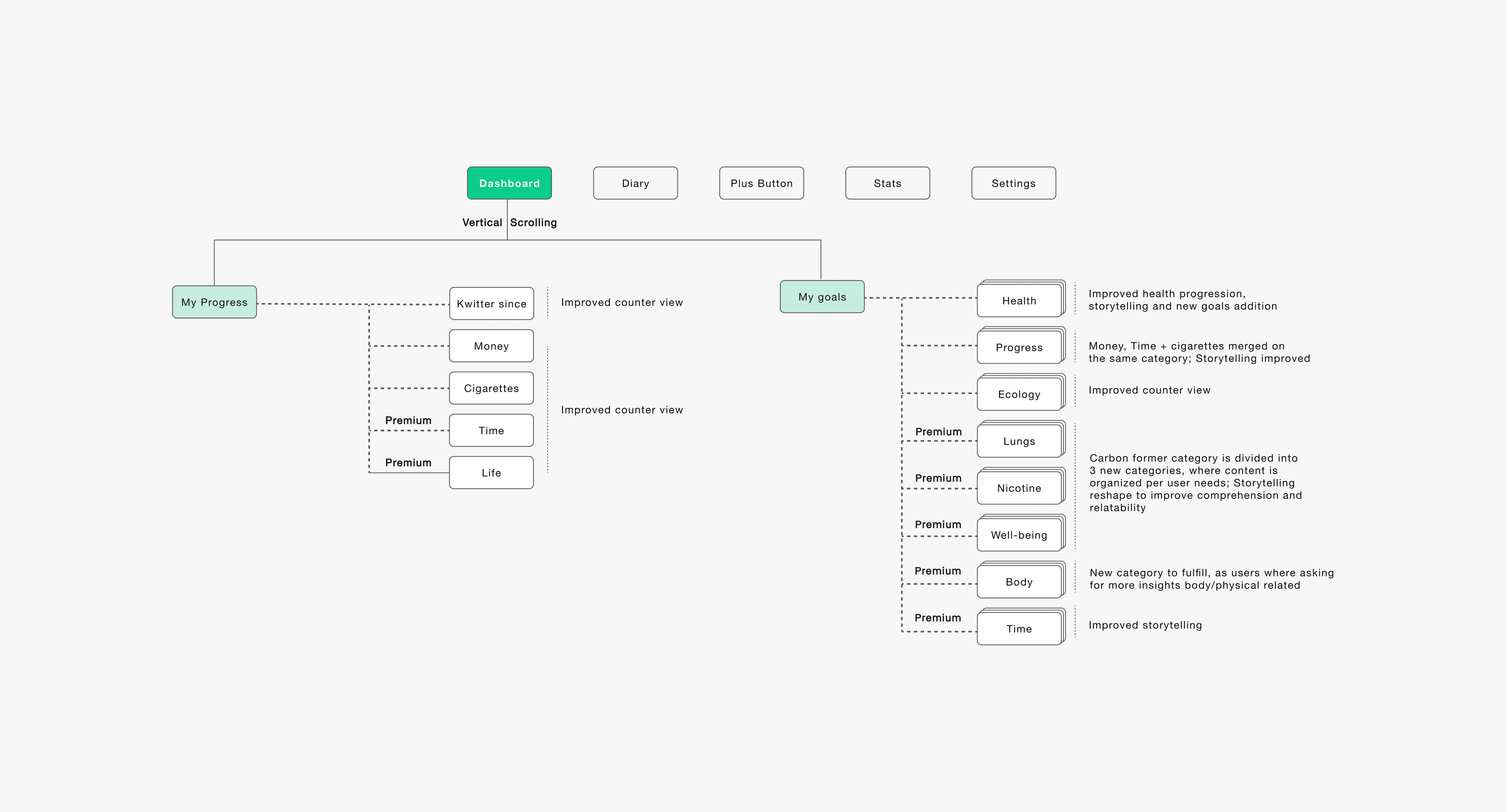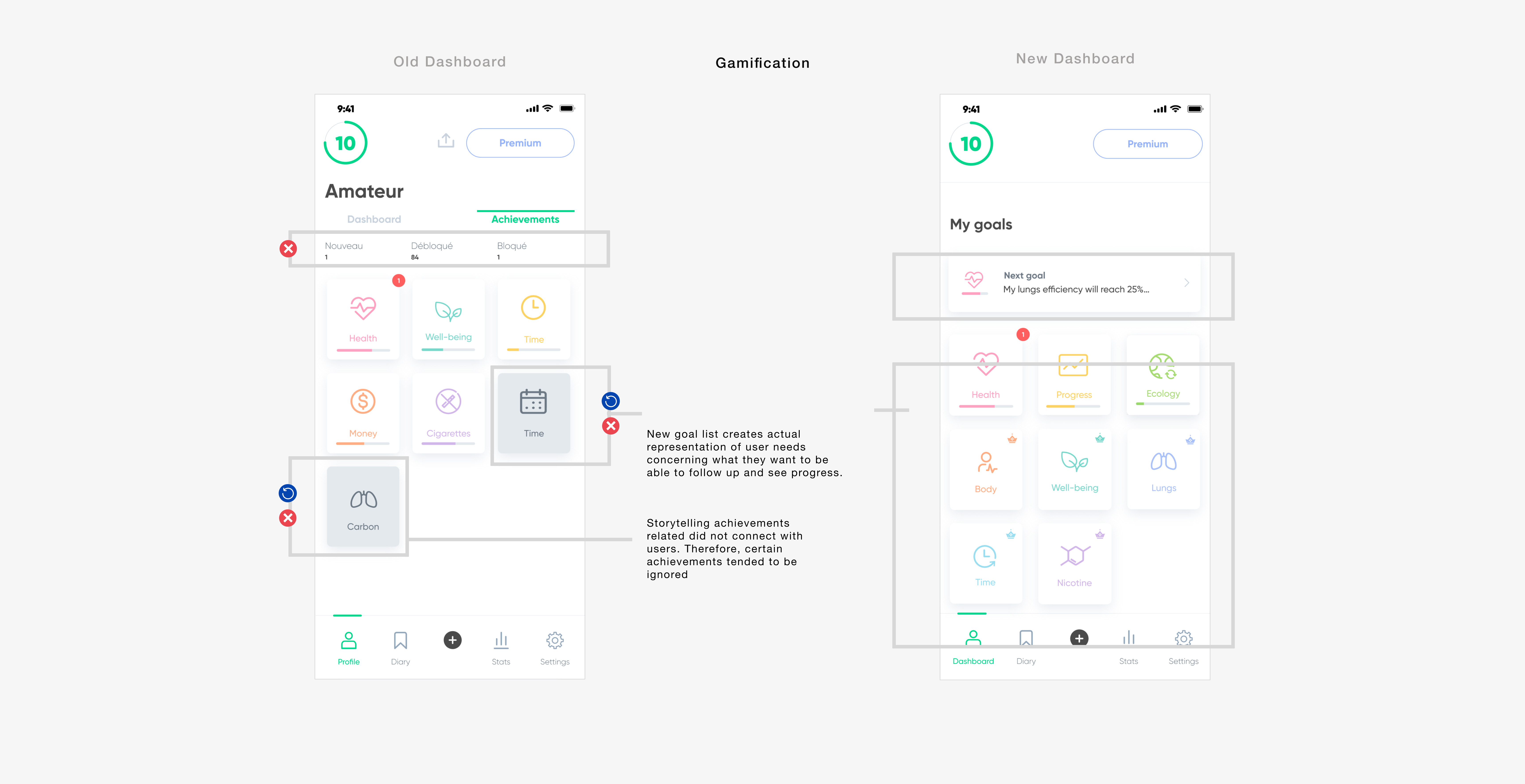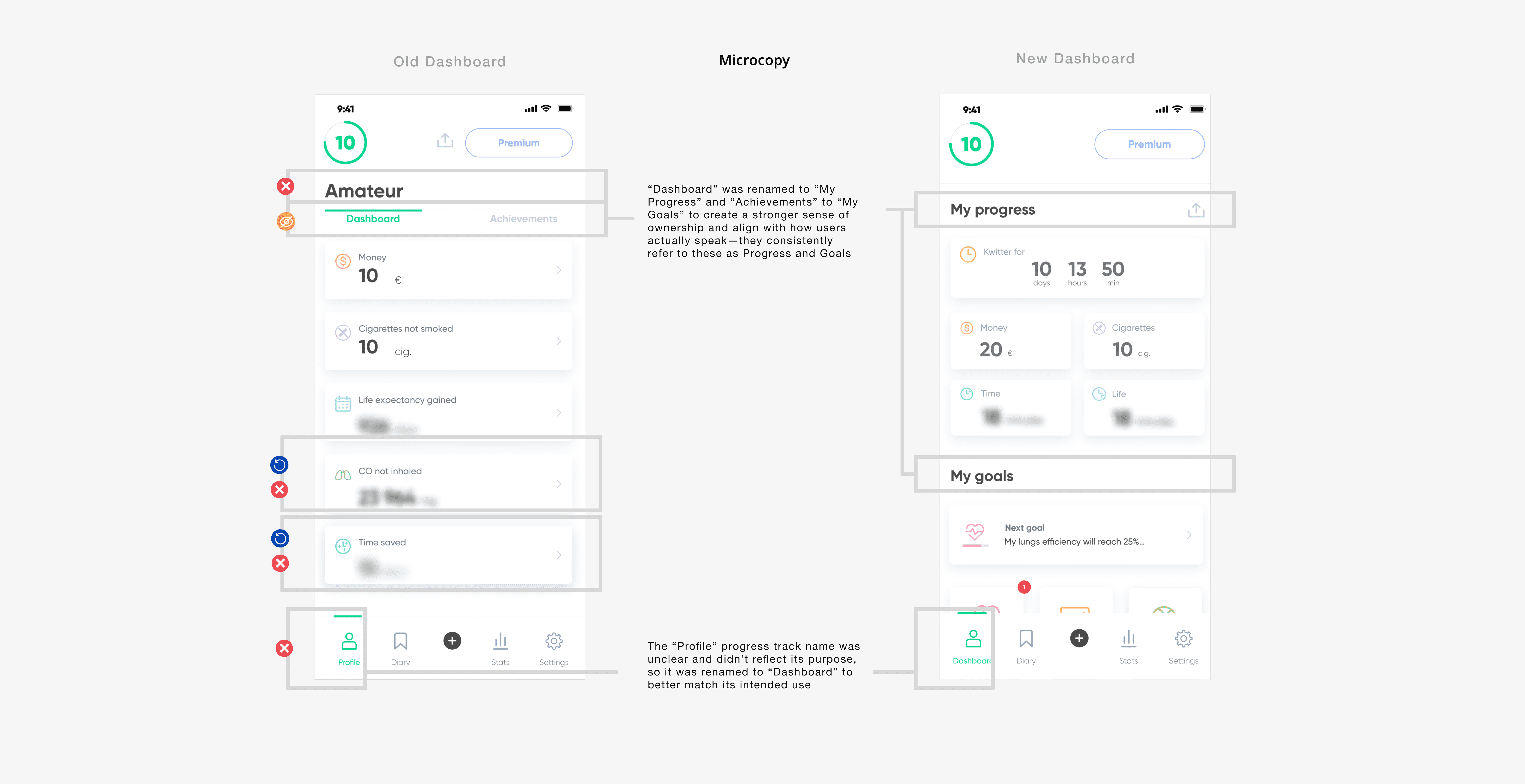 The Dashboard — the core of the experience — was reimagined as a central hub for progress and motivation. Information architecture was simplified to reduce friction and surface what matters. The gamification layer was rebuilt to better reflect real progress over time, expanding goals and reinforcing intrinsic motivation. At the same time, UX writing was aligned with how users naturally describe their journey, making the experience more relatable and meaningful.