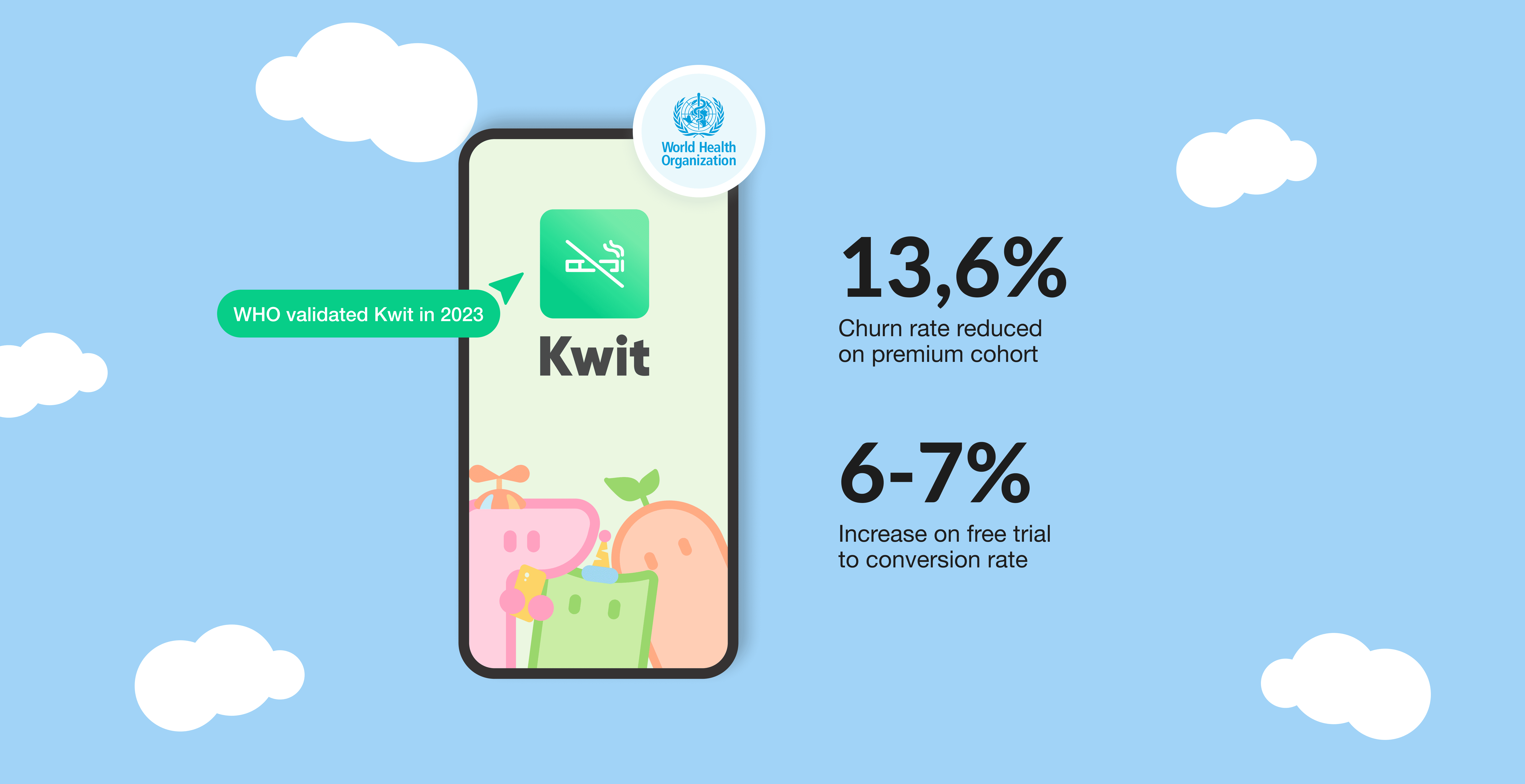 Kwit’s app is a global wellness tool, helping over 3 million users build healthier habits by quitting smoking. The app is freemium, with premium users seeking extra support during the hardest early weeks. The ultimate goal: keep users smoke-free while giving premium subscribers the guidance they need to succeed.