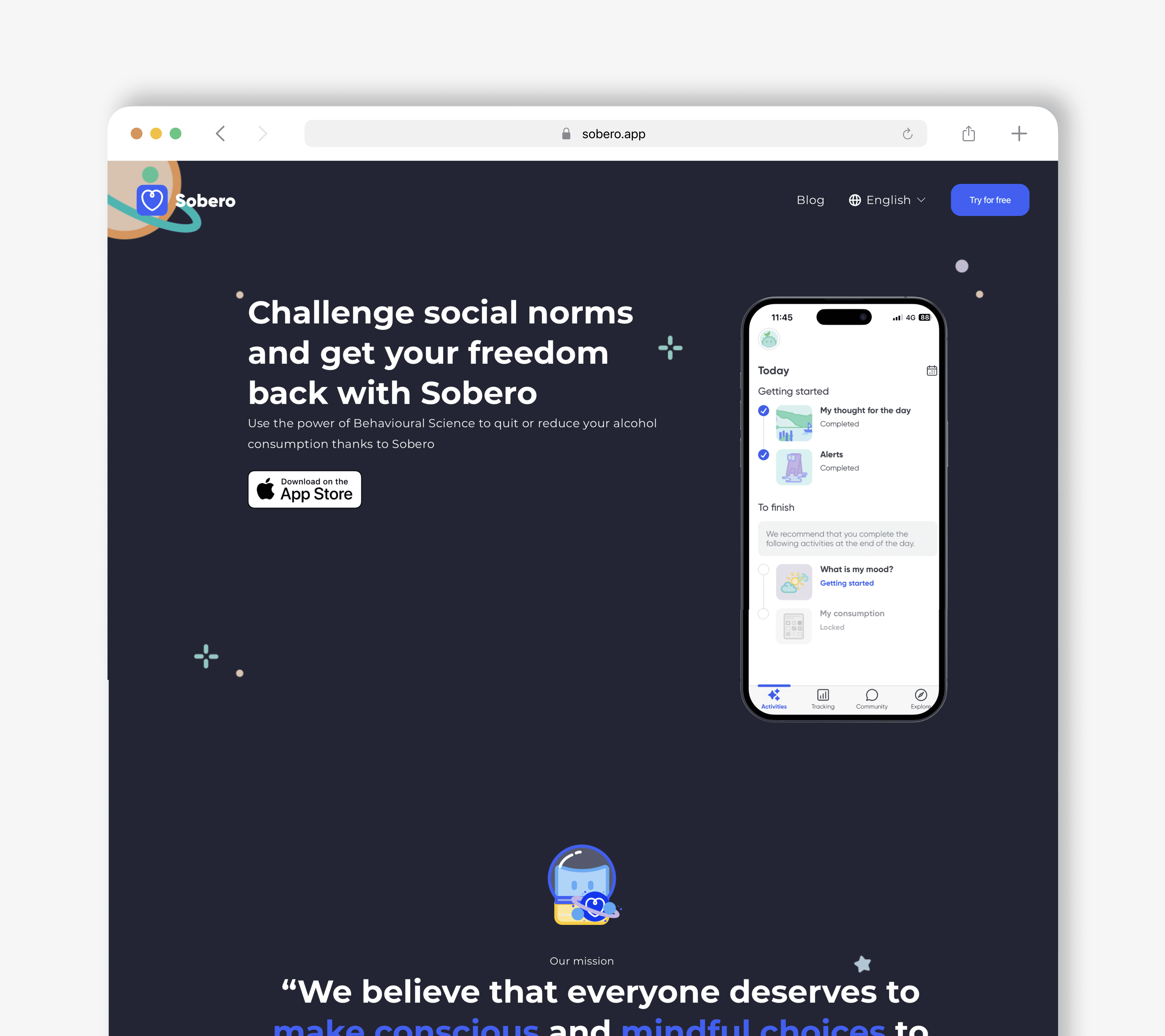 That reframe — from restriction to intention — became Sobero's north star. Our users weren't giving something up, they're choosing clarity and intention. The space metaphor connected their everyday acts to something expansive and aspirational.